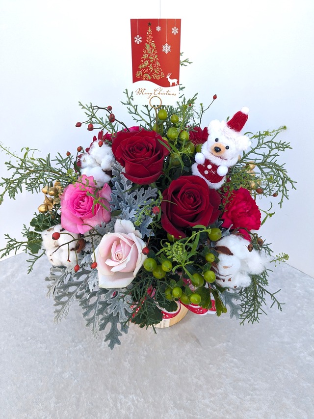フレッシュなピンクの薔薇のアレンジメントで、クリスマスを華やかに彩りませんか? 可愛らしさと上品さを兼ね備えた色合いで、特別な日にぴったりです。 大切な方へのプレゼントにも最適です。 ★無料クリスマスカード付き★ 【サイズ】 高さ40cm 幅35cm 【使用花材】 ・バラ ピンク系 ・バラ 赤 ・ガーベラ ・ヒペリカム ・野ばら ・ブルーアイス ・ヒバ ・ダスティミラー ・タラスピ ・コットンフラワー