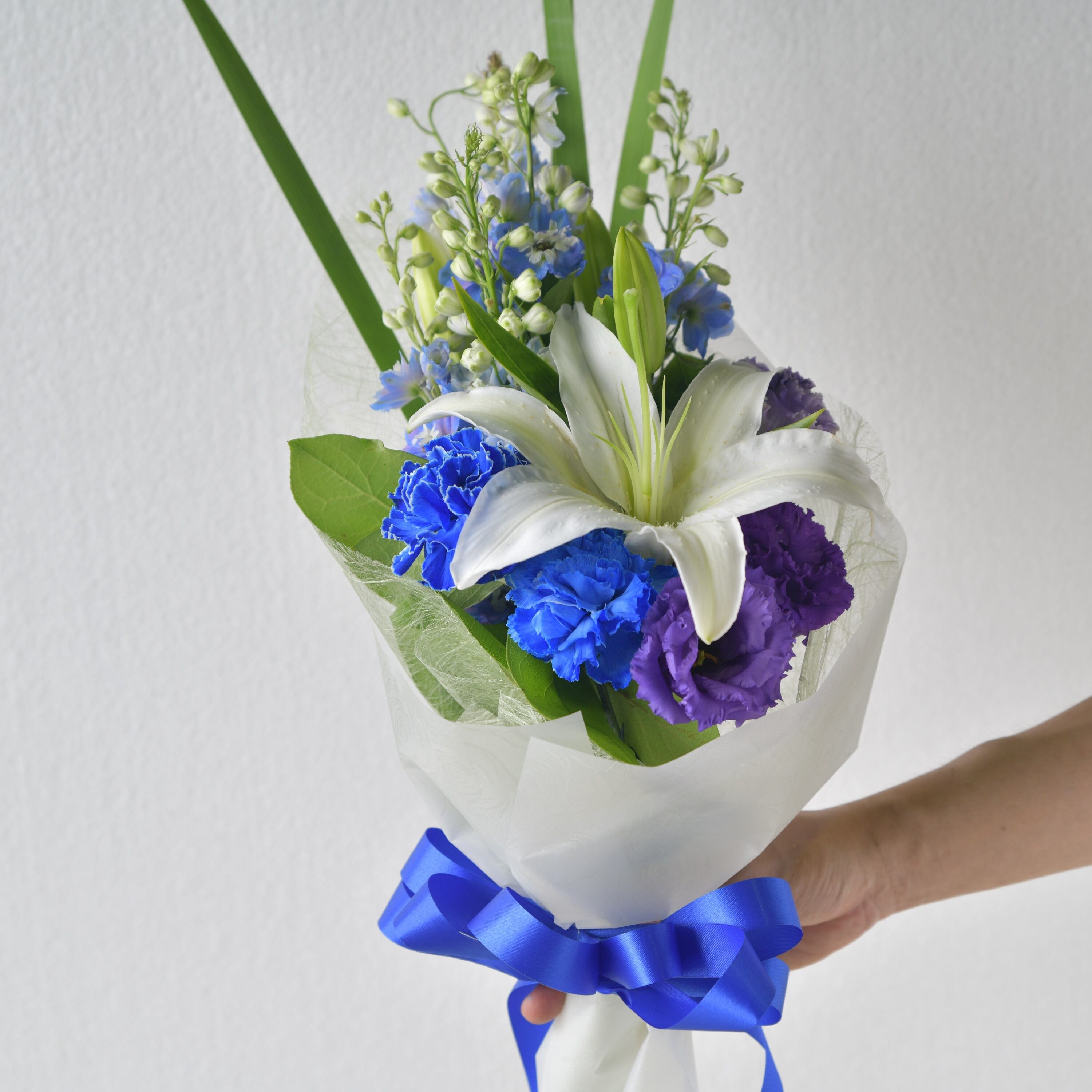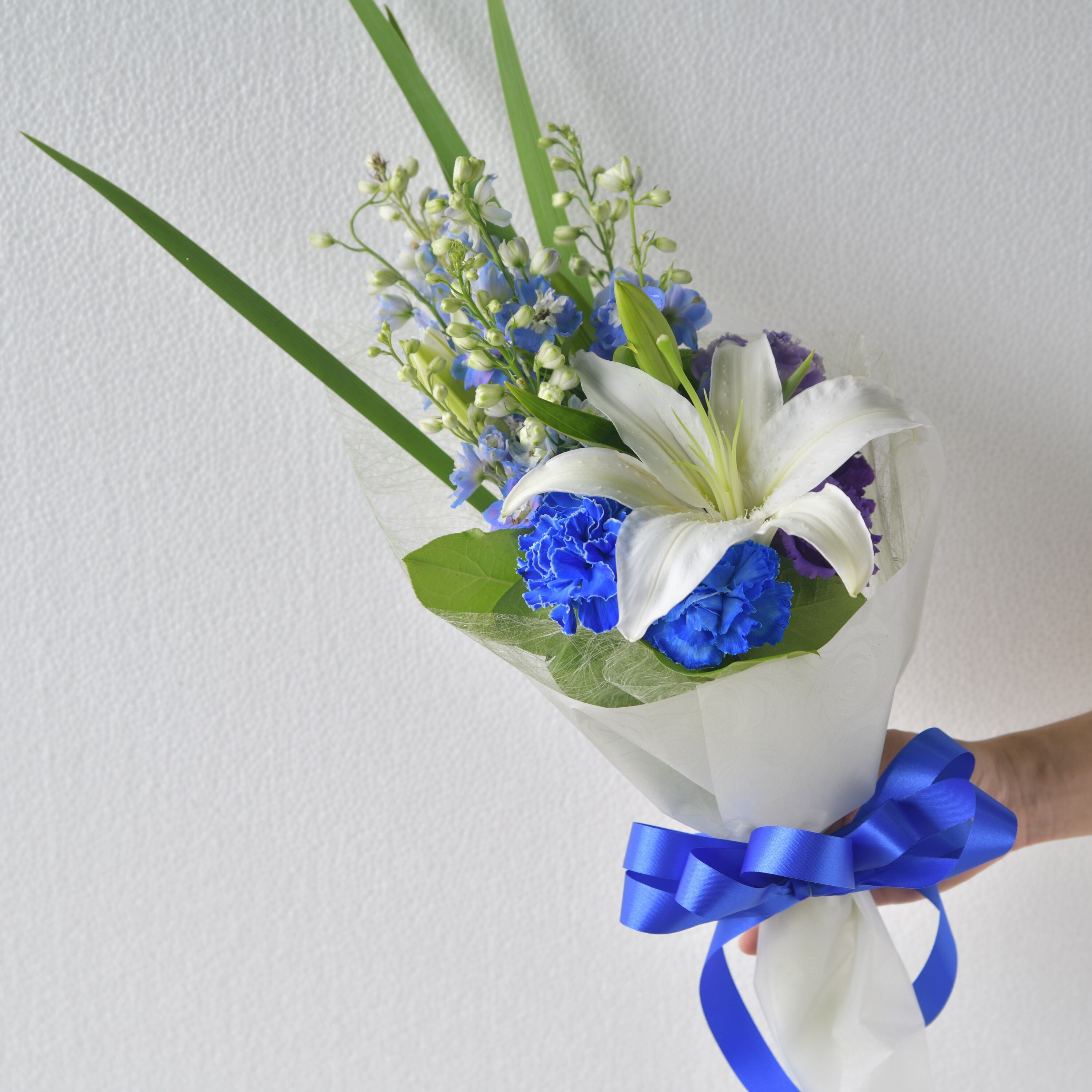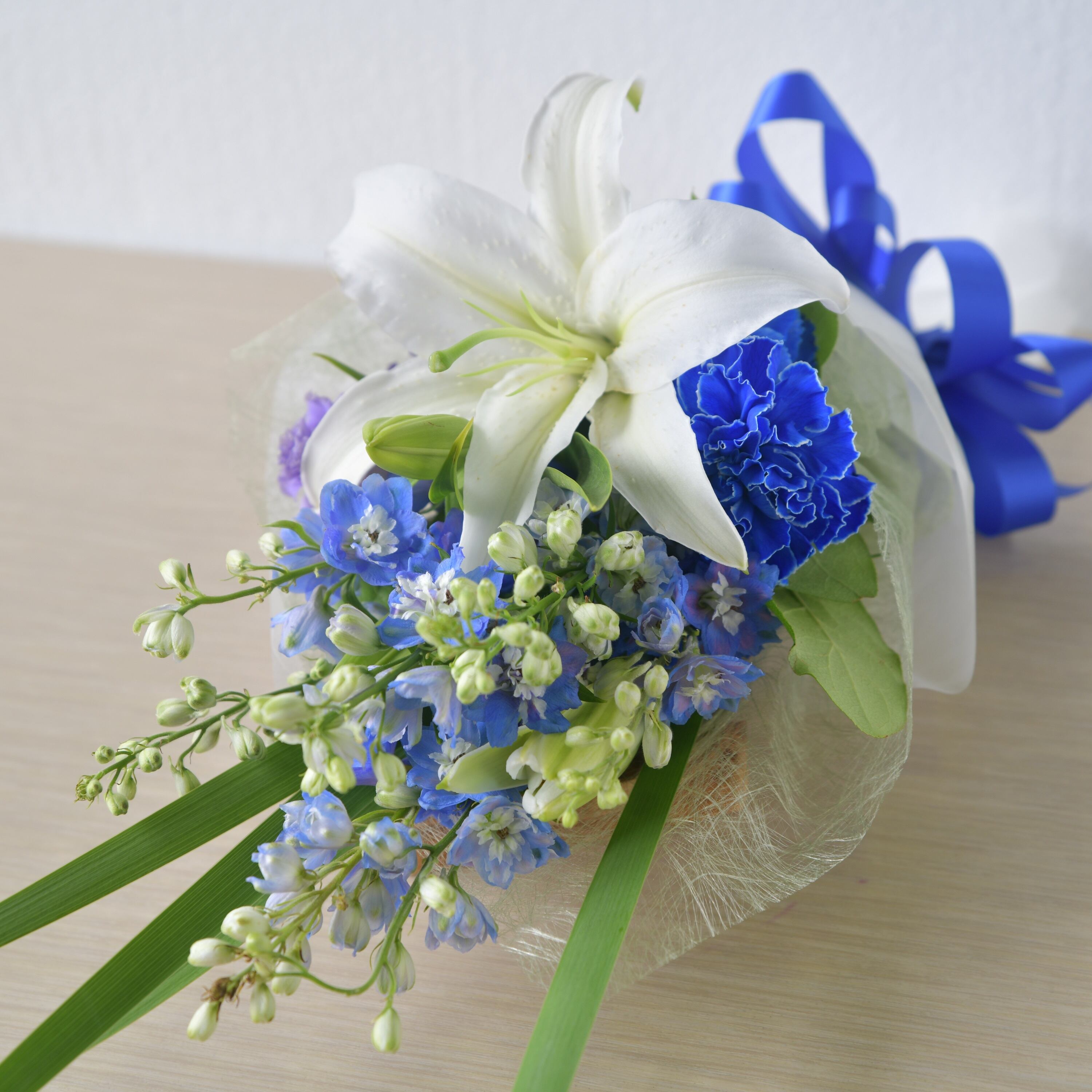 ブルーのデルフィニュームと白いユリをメインにした清涼感のある花束です。