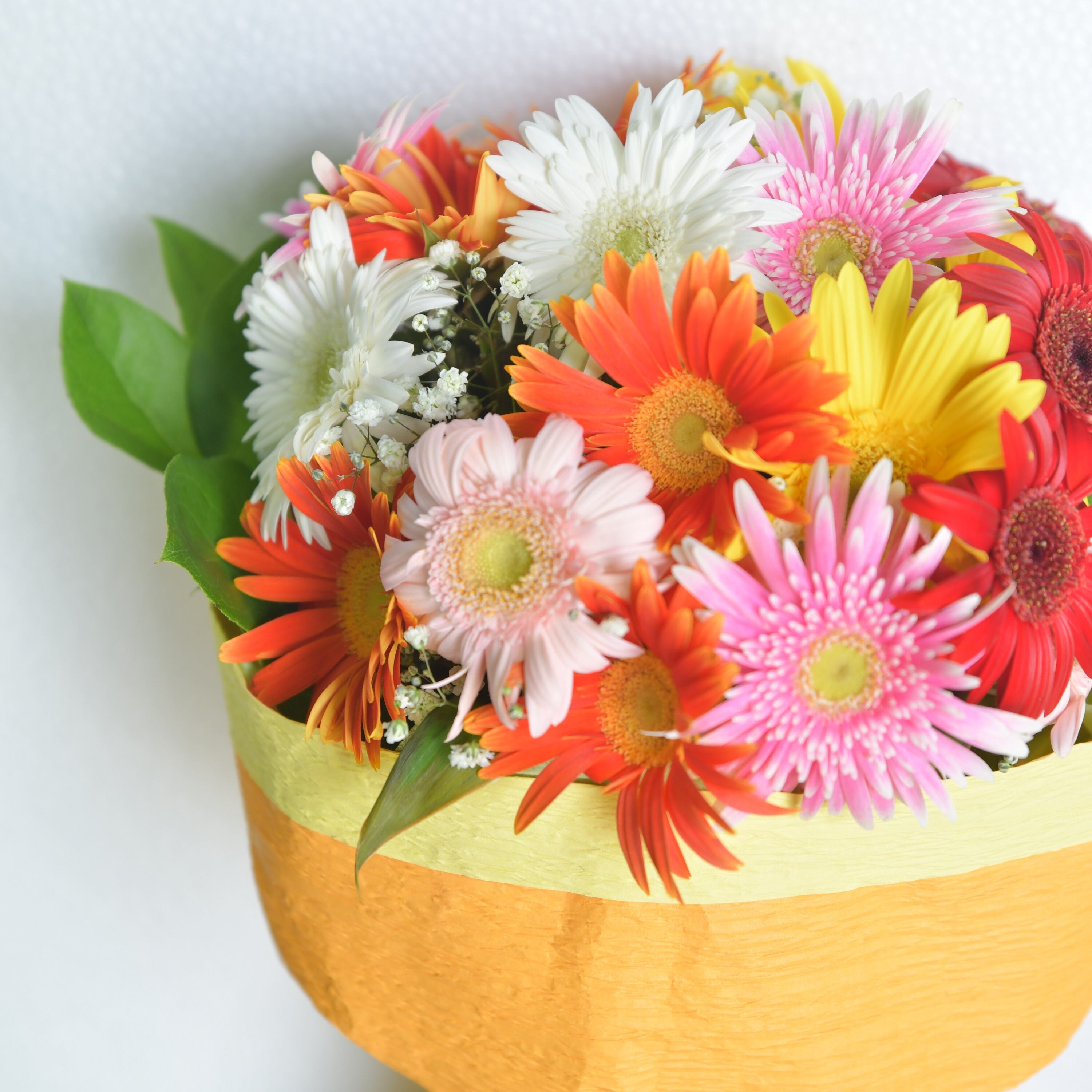 色とりどりのガーベラにかすみ草を添えたラウンドブーケです。