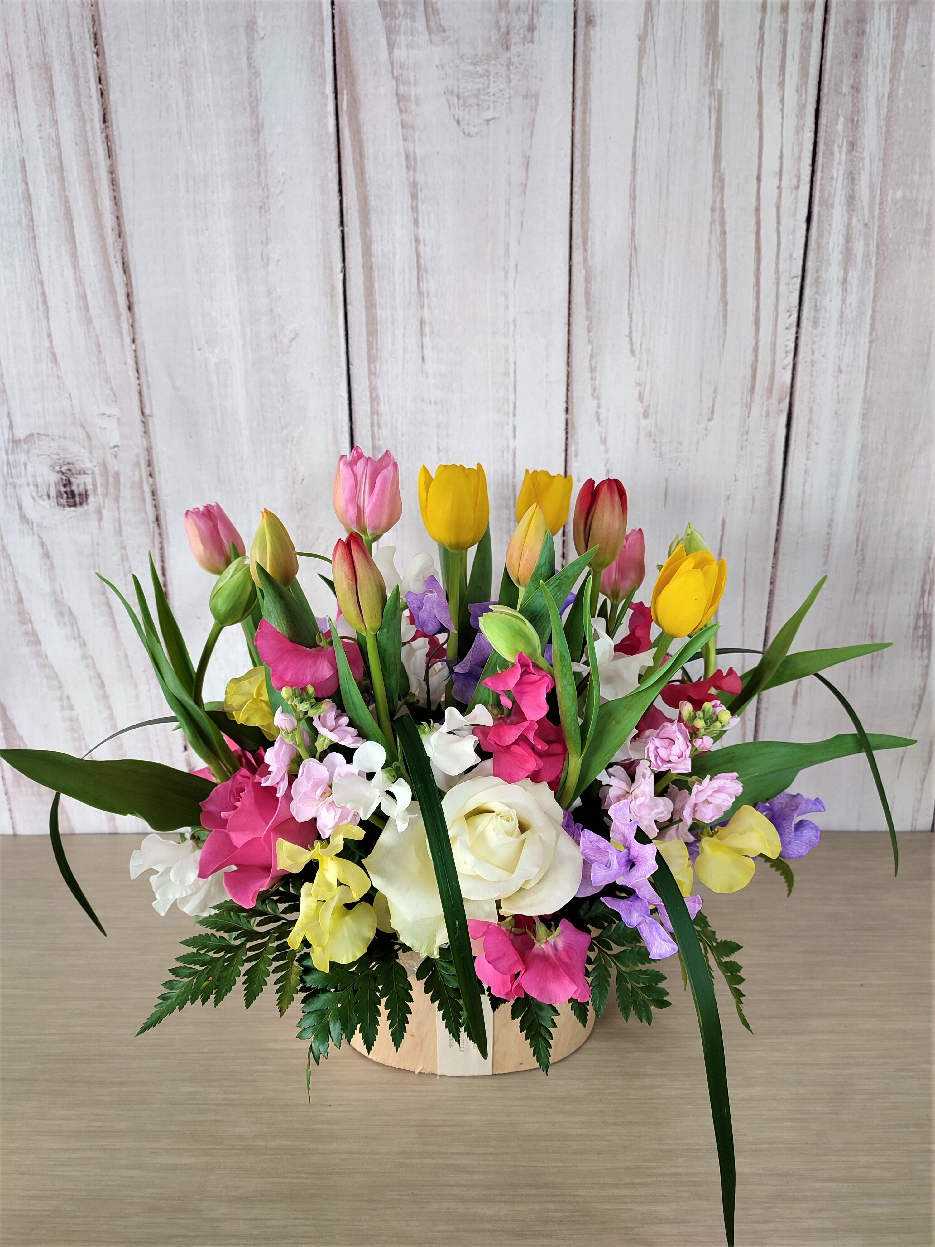 カラフルなチューリップやスイートピーを使った春の香りを感じさせるアレンジメントです。