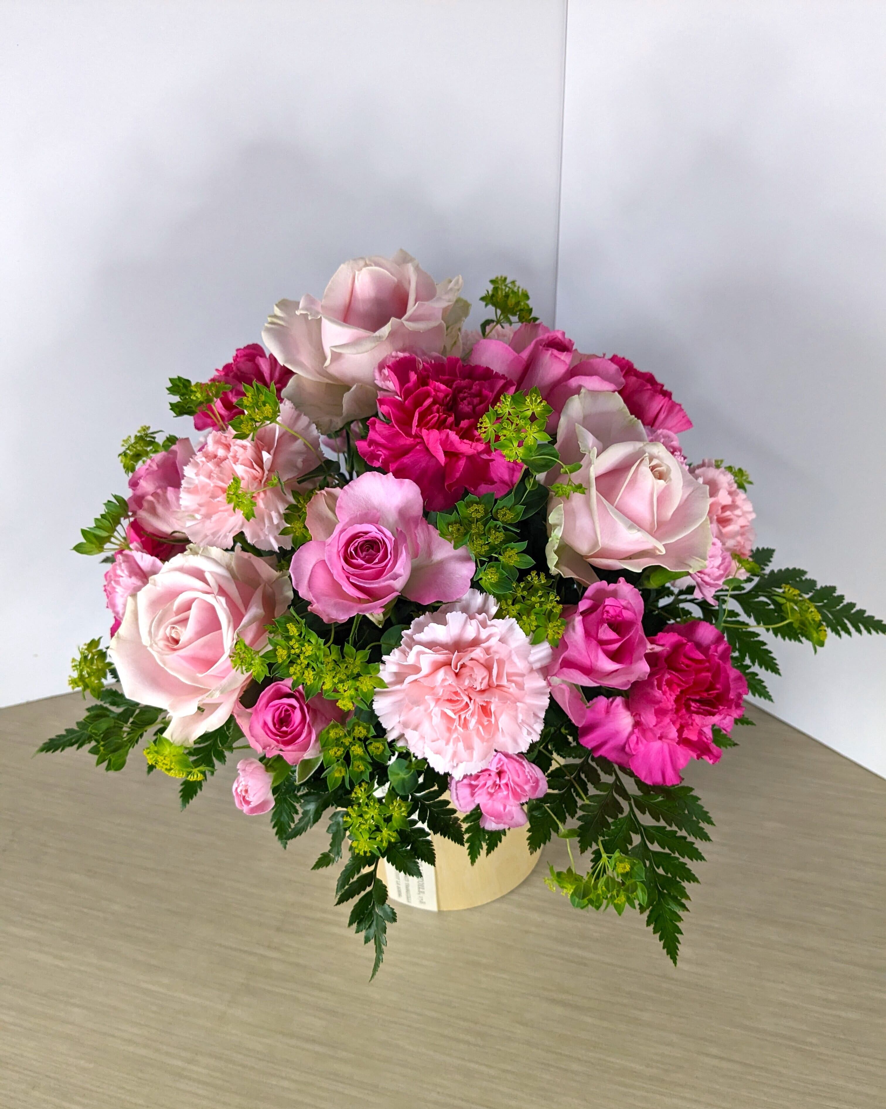 母の日にぴったりなピンクでまとめたアレンジメントです。心を込めて選んだ薔薇とカーネーションのピンク色が、母の日の特別感を演出してくれます。大切な人にほっと一息ついてもらえるお花の贈り物を。