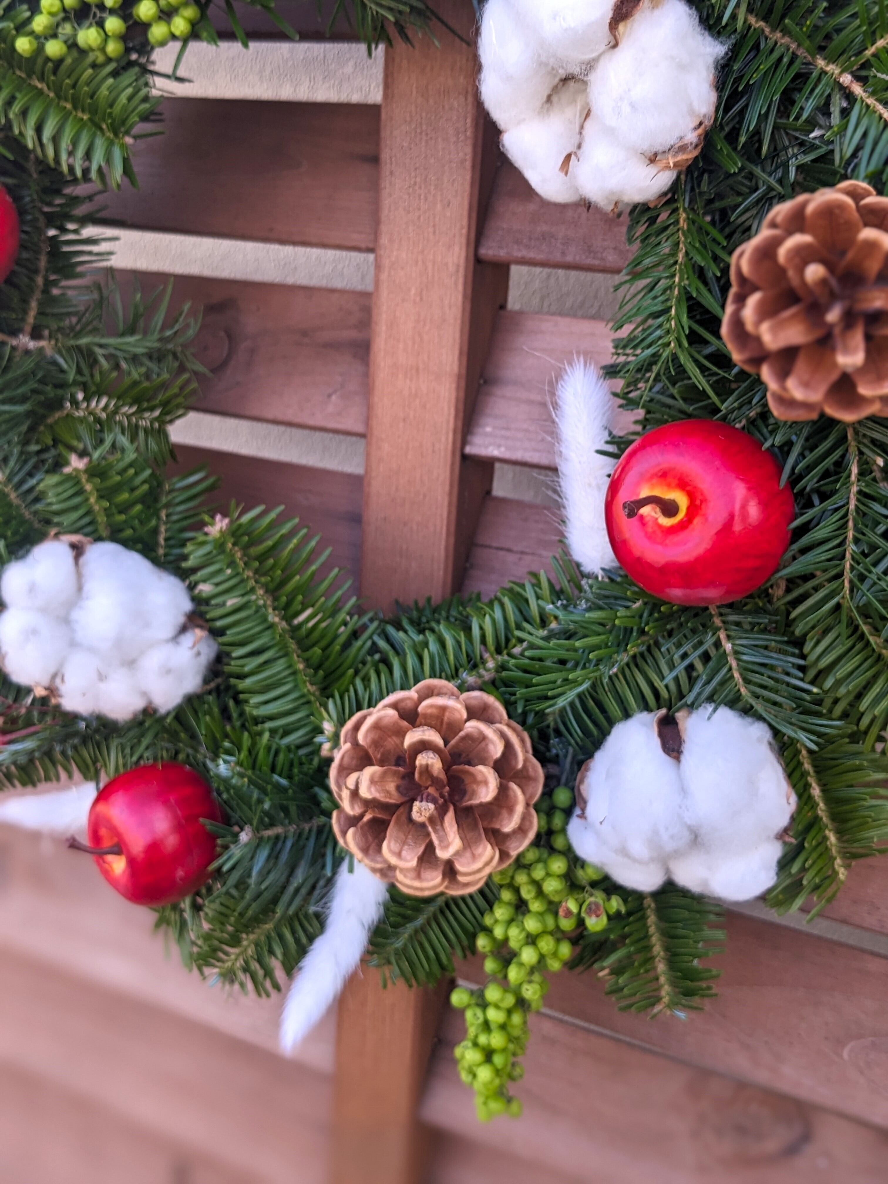 ・もみの木 ・コットンフラワー ・ペッパーベリー(プリザーブド) ・姫リンゴ(イミテーション) ・松ぼっくり ・ラグラス(プリザーブド)