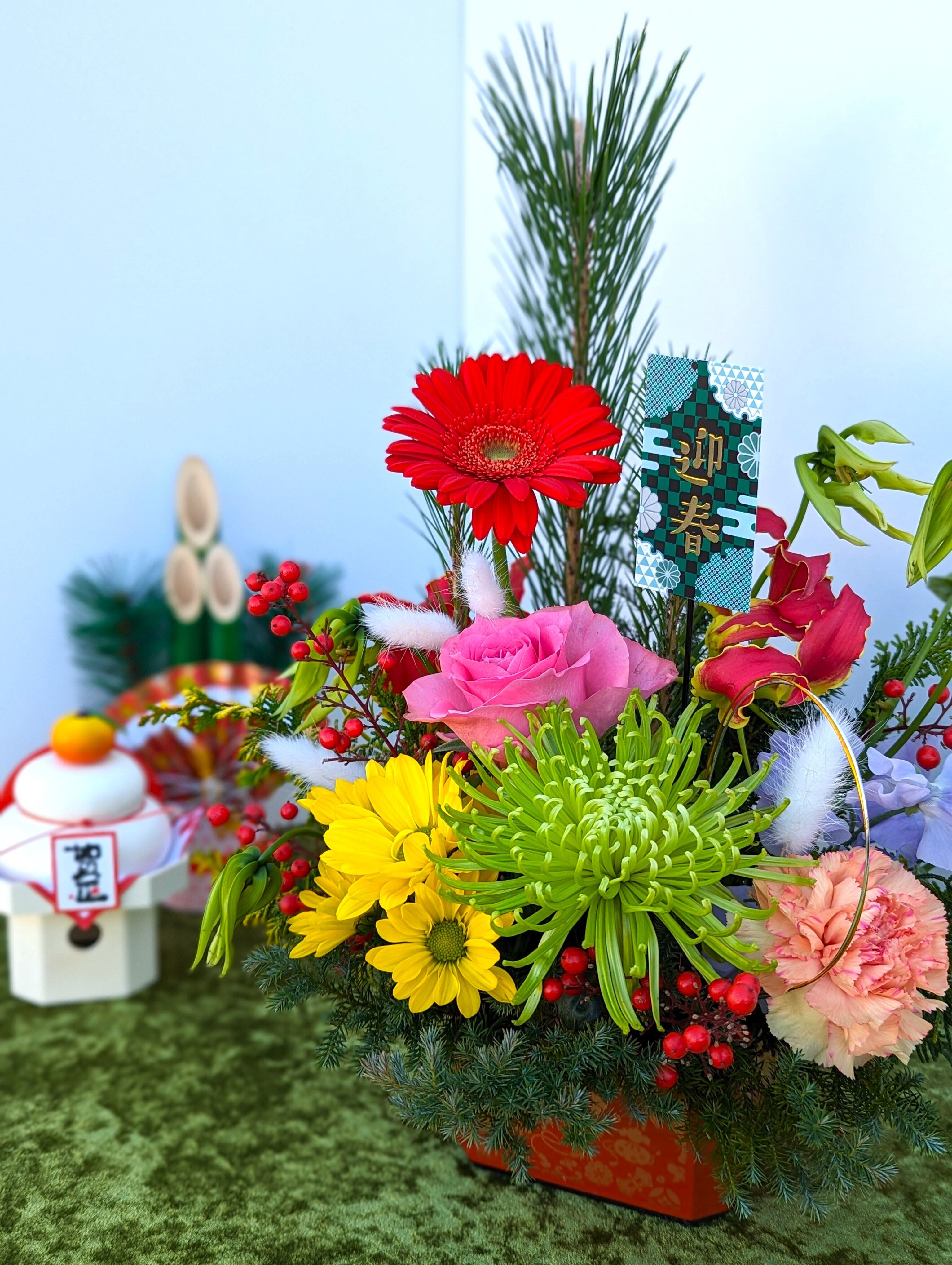 松や輪菊、南天などの縁起の良いアイテムに春を先取りした『スイトピー』を添えました。