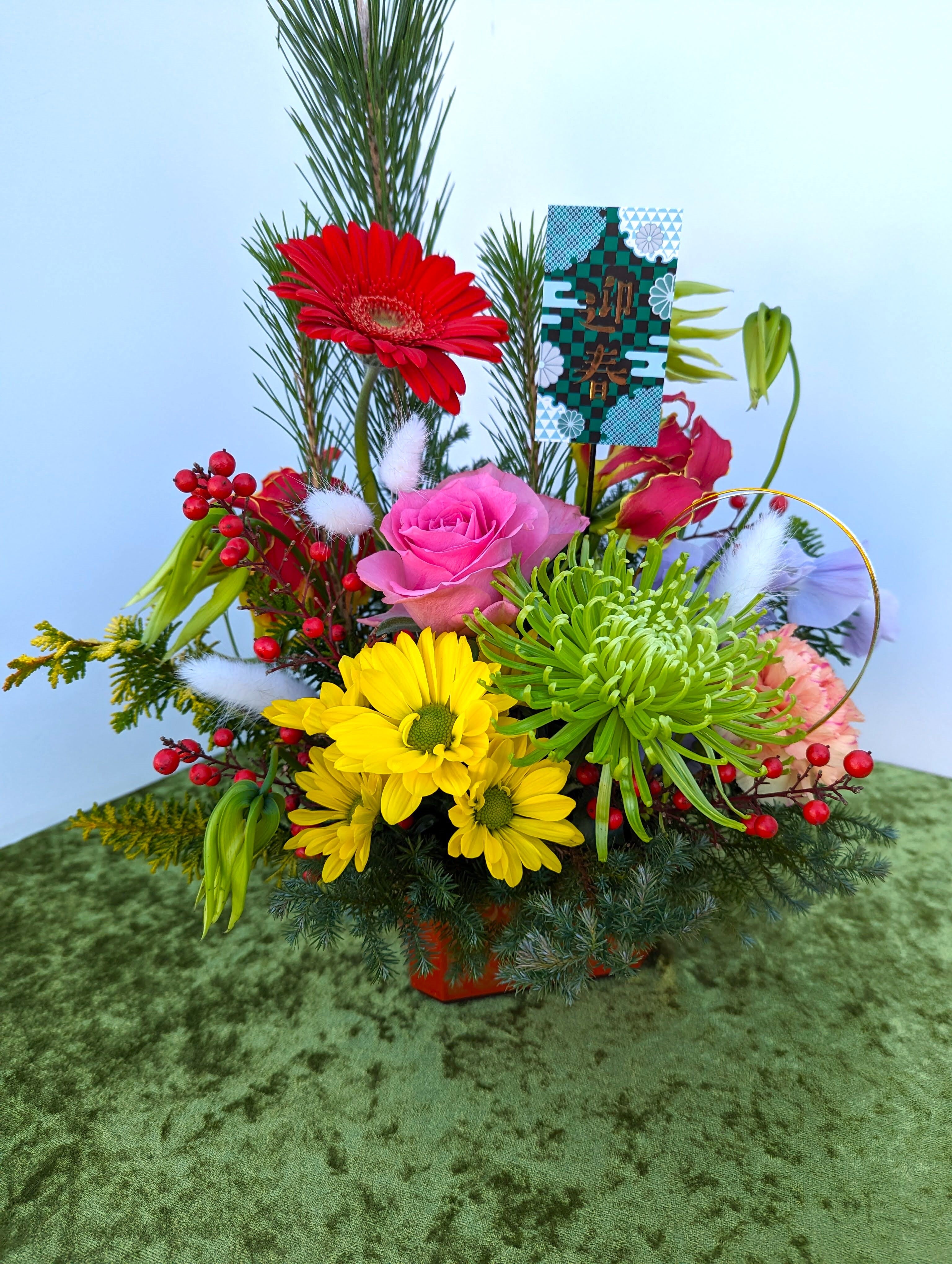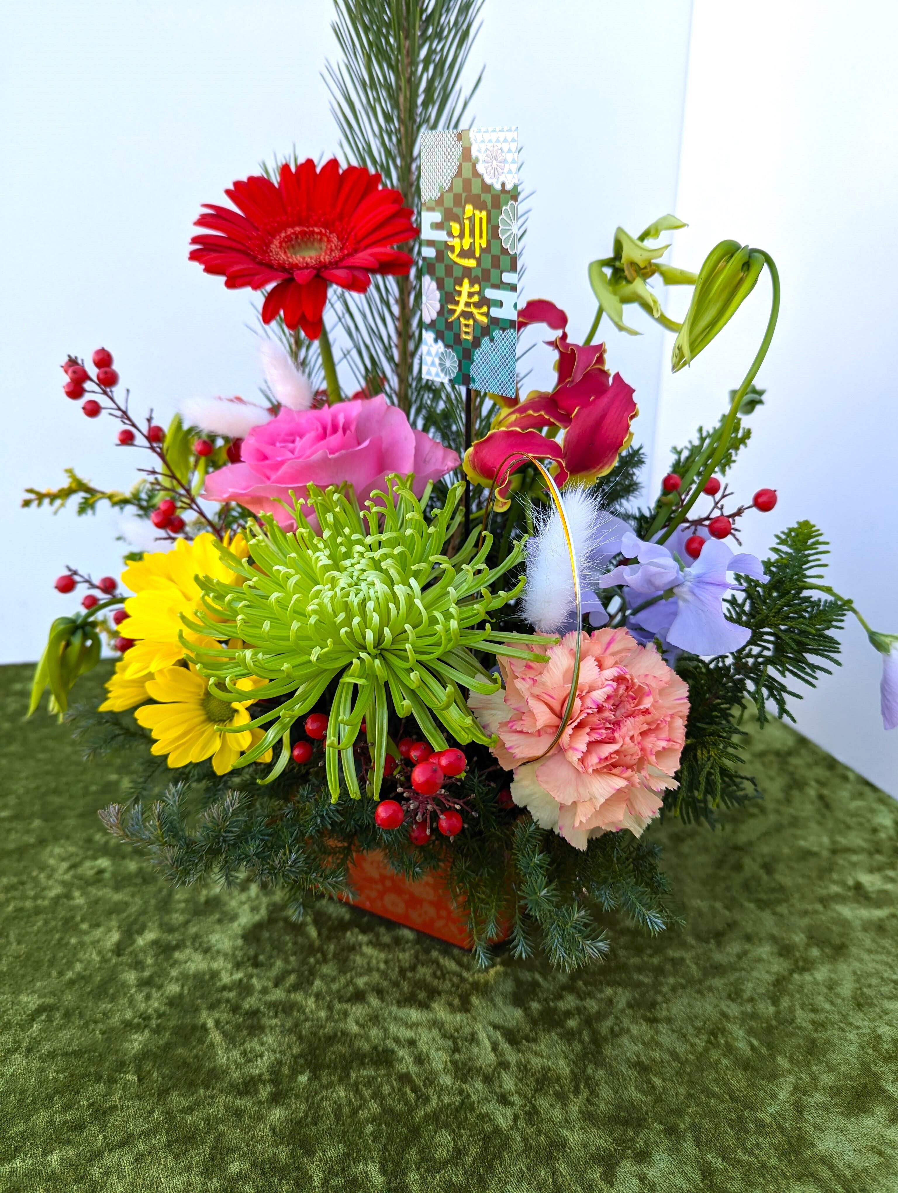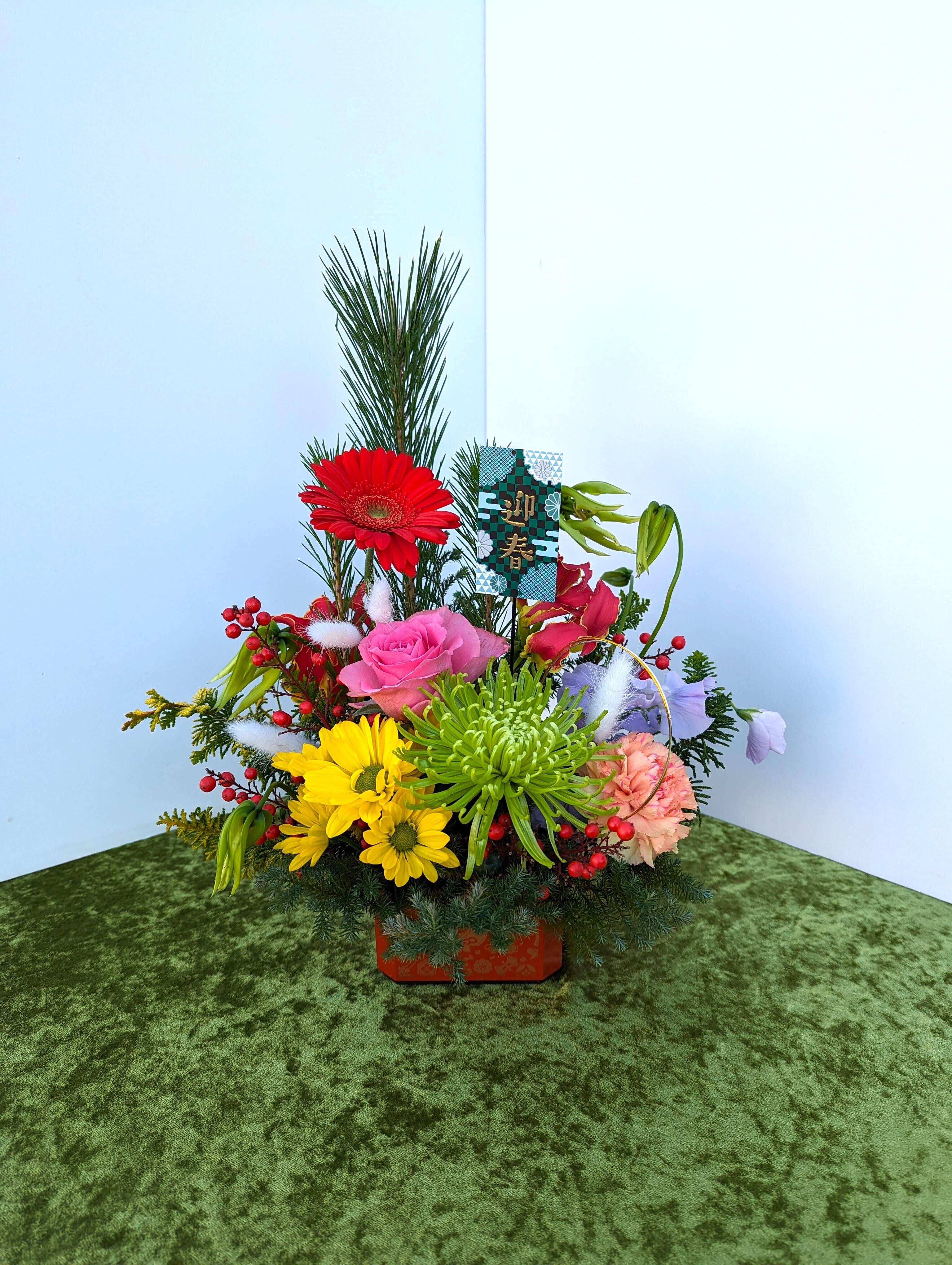 ・若松 ・南天または千両 ・スイトピー ・マム ・グロリオサ ・バラ ・カーネーション